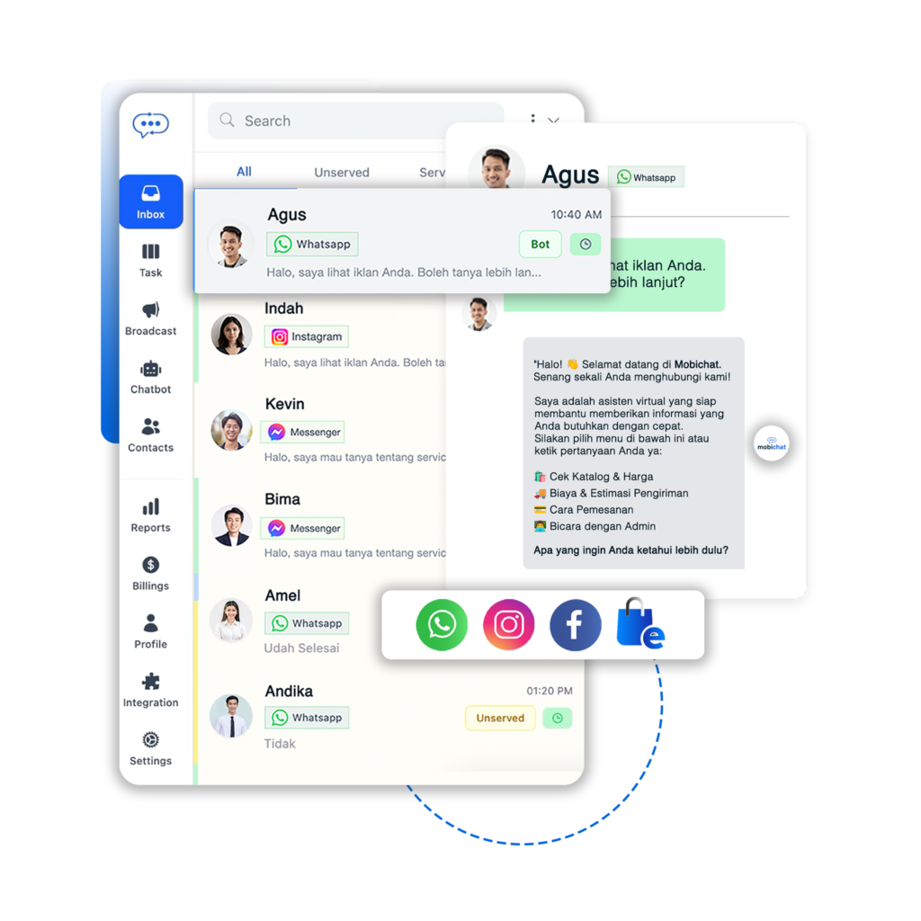 - Memusatkan semua pesan masuk dari berbagai platform ke satu dashboard.