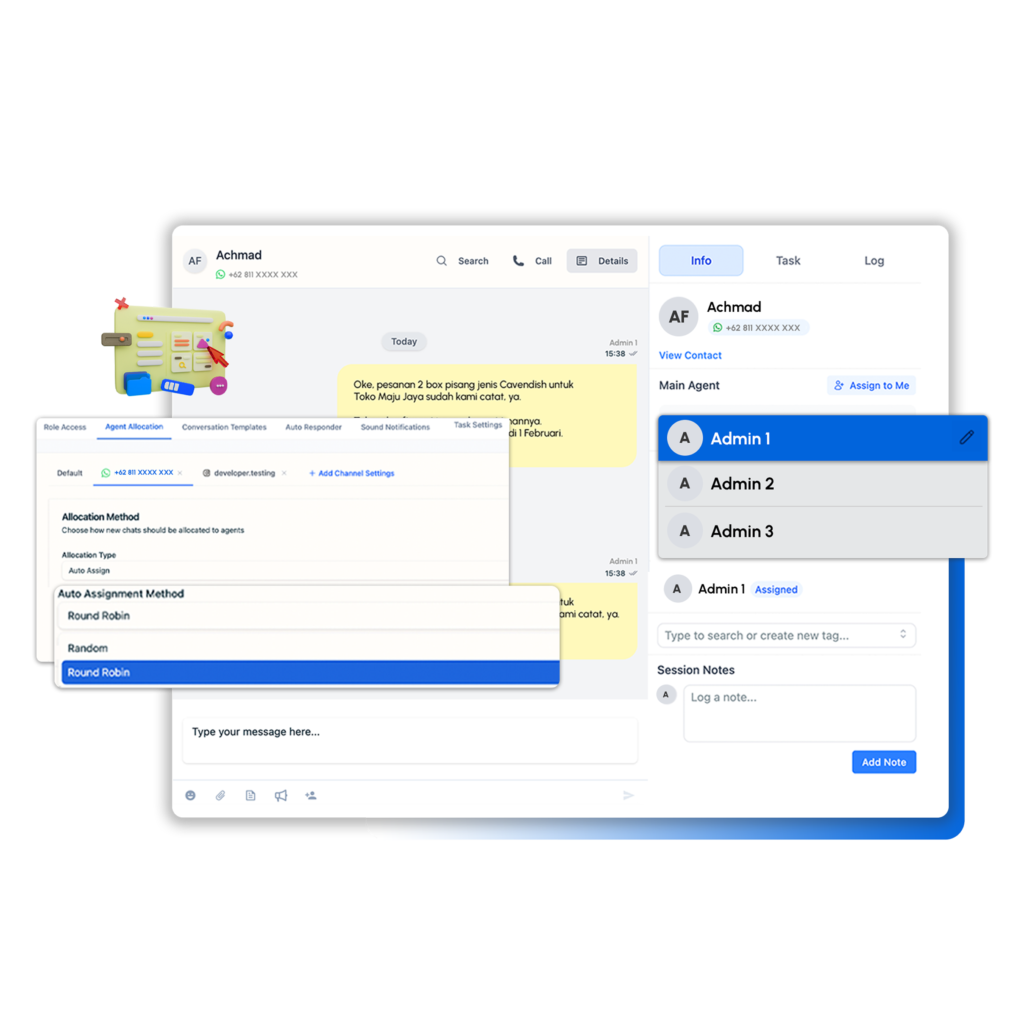 - Mengelola antrian pesan dan mendistribusikannya secara otomatis (auto-assignment) ke agen yang tepat.