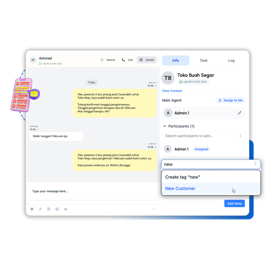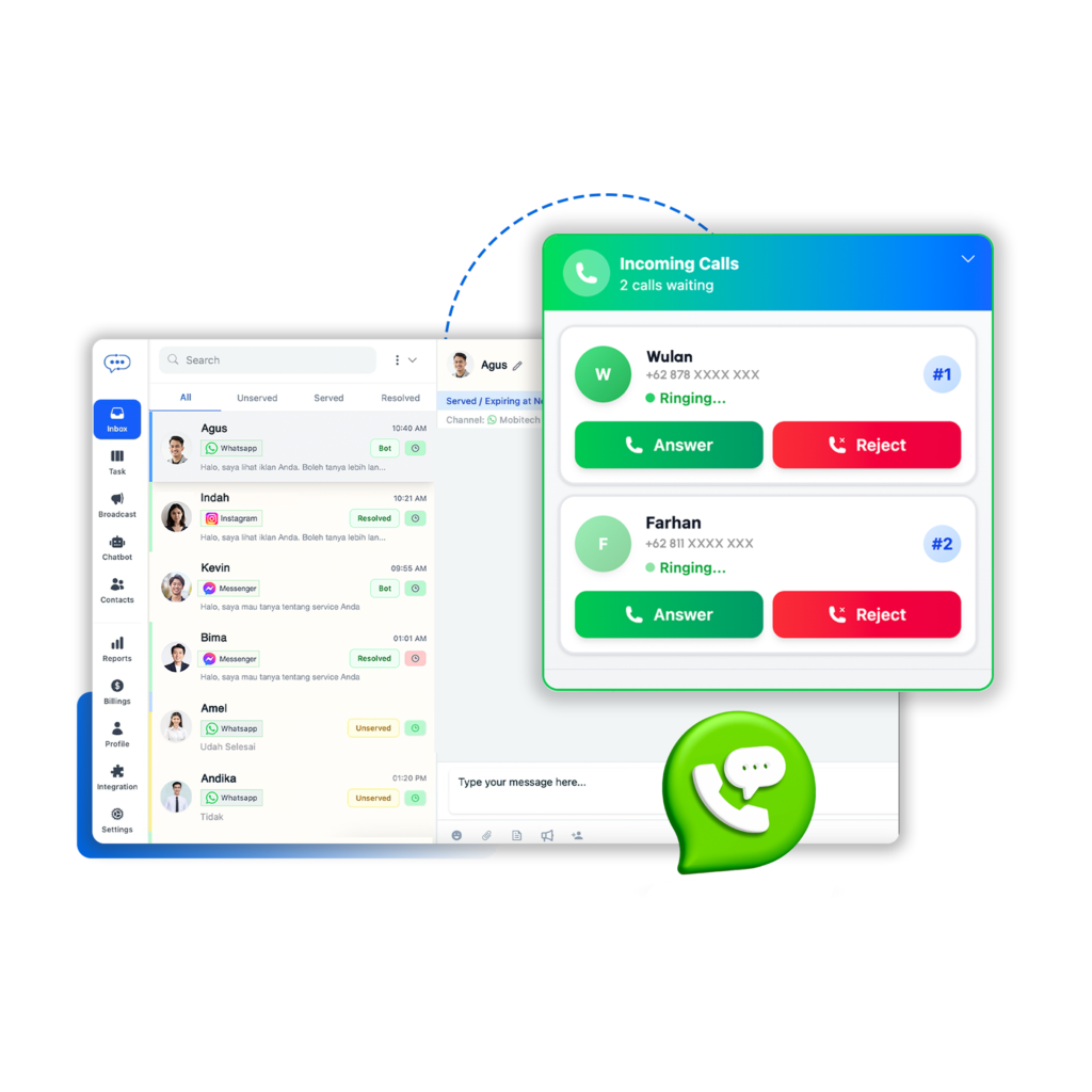 Menyatukan semua percakapan dari berbagai channel (Whatsapp, Instagram, dan Facebook) di satu dashboard. Balas chat, tanpa repot pindah aplikasi