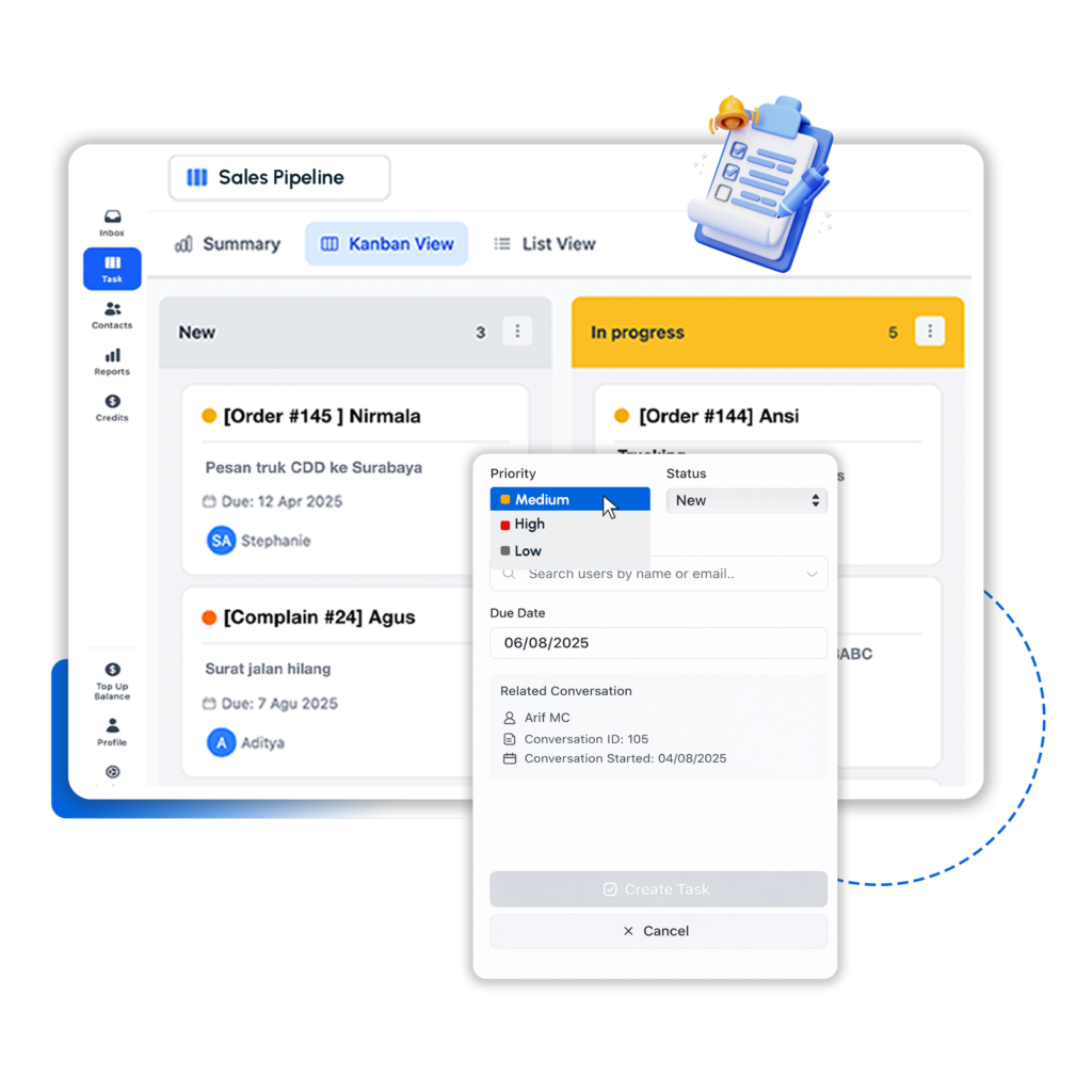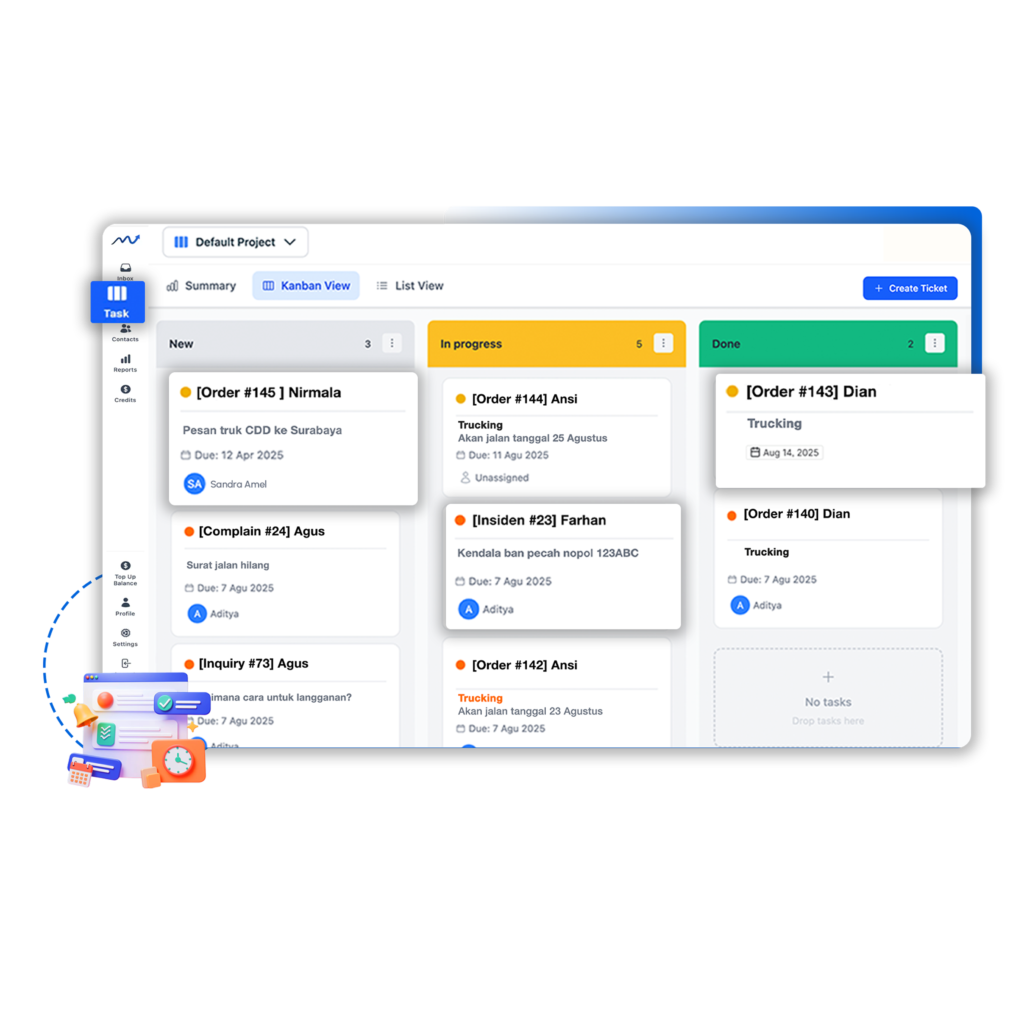 Task management yang otomatis ubah chat jadi tiket yang mudah dilacak dalam satu dashboard.