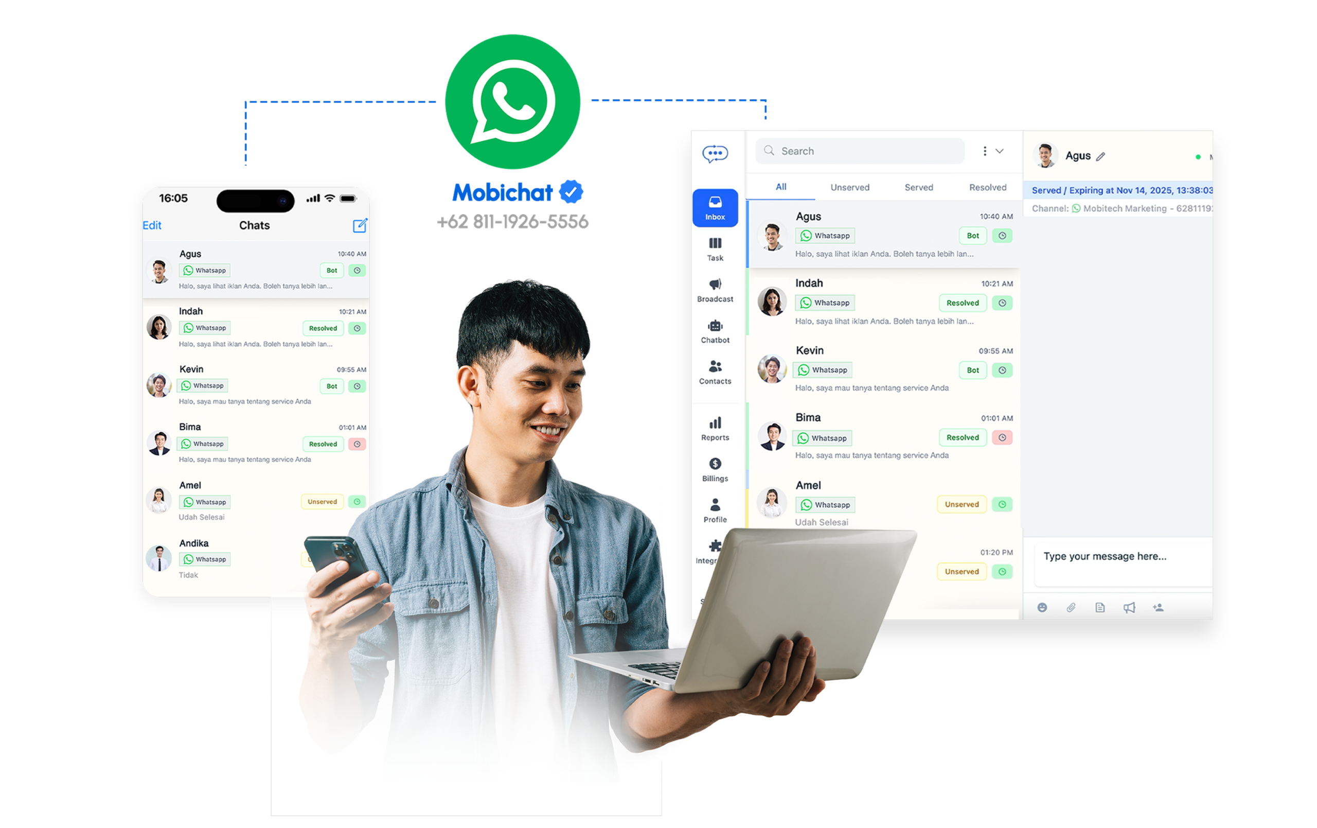 Dengan WhatsApp Coexistence, kamu bisa berkomunikasi dengan pelanggan secara lebih fleksibel, baik lewat handphone maupun PC. Semua percakapan tetap tersinkron otomatis di ponsel dan CRM, tanpa kehilangan riwayat chat.
